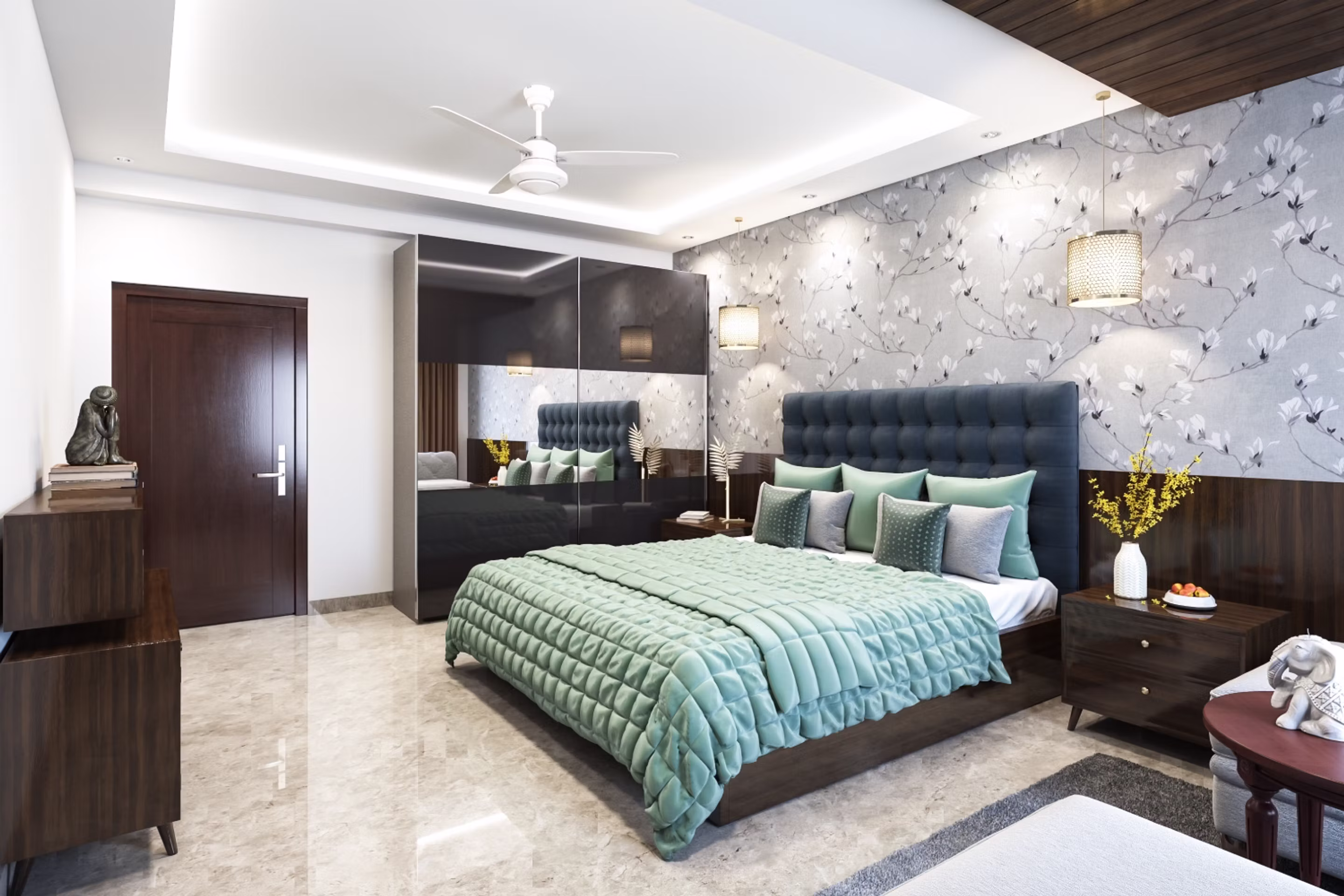 In this modern era, we are featuring a two-door sliding wardrobe and floral wallpaper in master bedroom design.